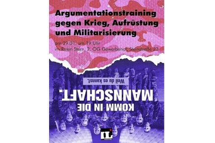 Viele sind damit nicht einverstanden und gleichzeitig unsicher, wie man der Mobilmachung im Alltag, in der Familie, im Freund*innenkreis oder am Arbeitsplatz etwas entgegensetzen kann. In unserem Argumentationstraining wollen wir gemeinsam erarbeiten, welche Positionen zu Krieg, Aufrüstung und Militarisierung es gibt, welche Argumente helfen, und wie man Menschen von einer antimilitaristischen Position überzeugen kann – ohne dass dabei die eigenen Ängste, Unsicherheiten und Fragezeichen unter den Tisch fallen müssen.