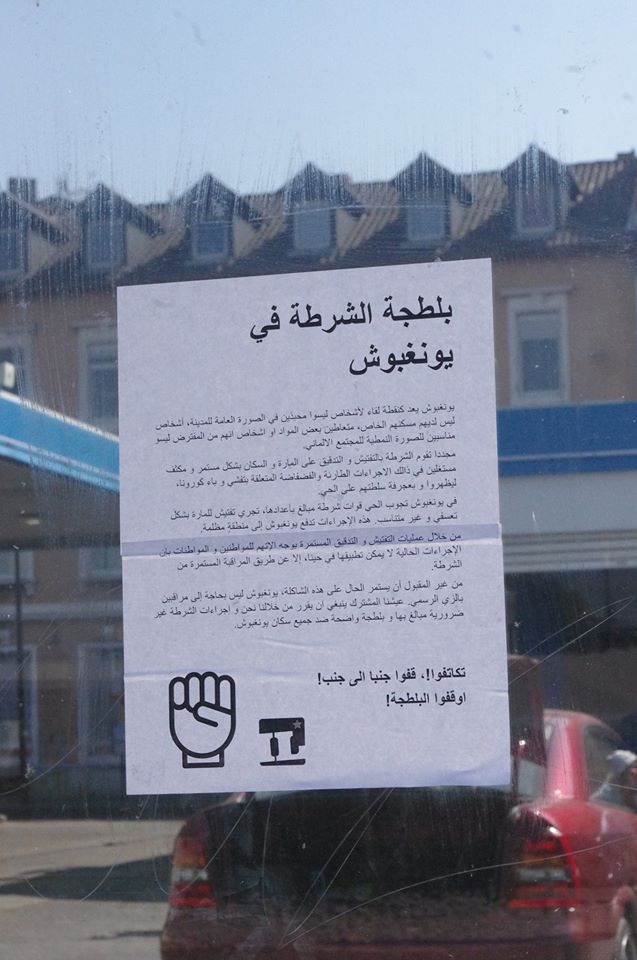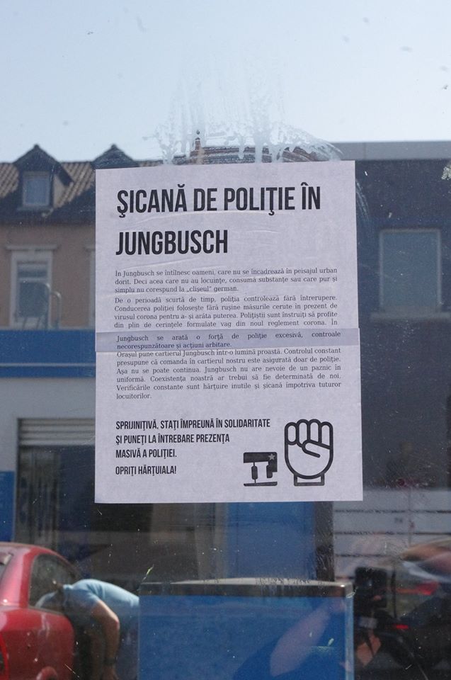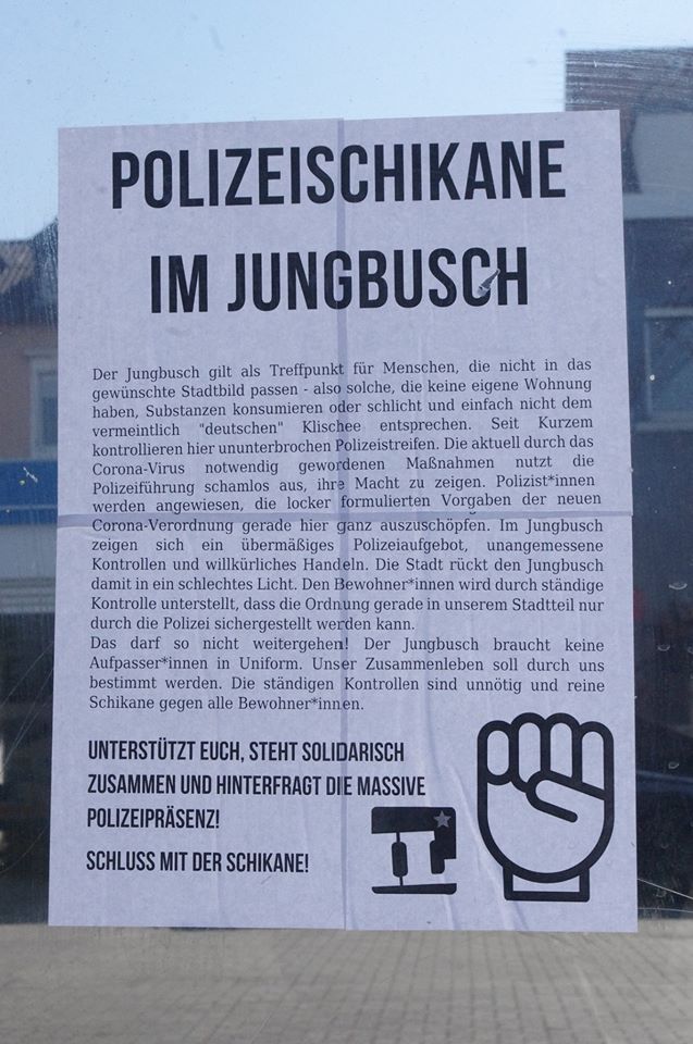 Wir haben im Jungbusch Wandzeitungen angebracht, um den Menschen dort zu zeigen, dass sie nicht allein sind mit ihrem Unmut über die wachsende Polizeischikane in diesem Viertel.