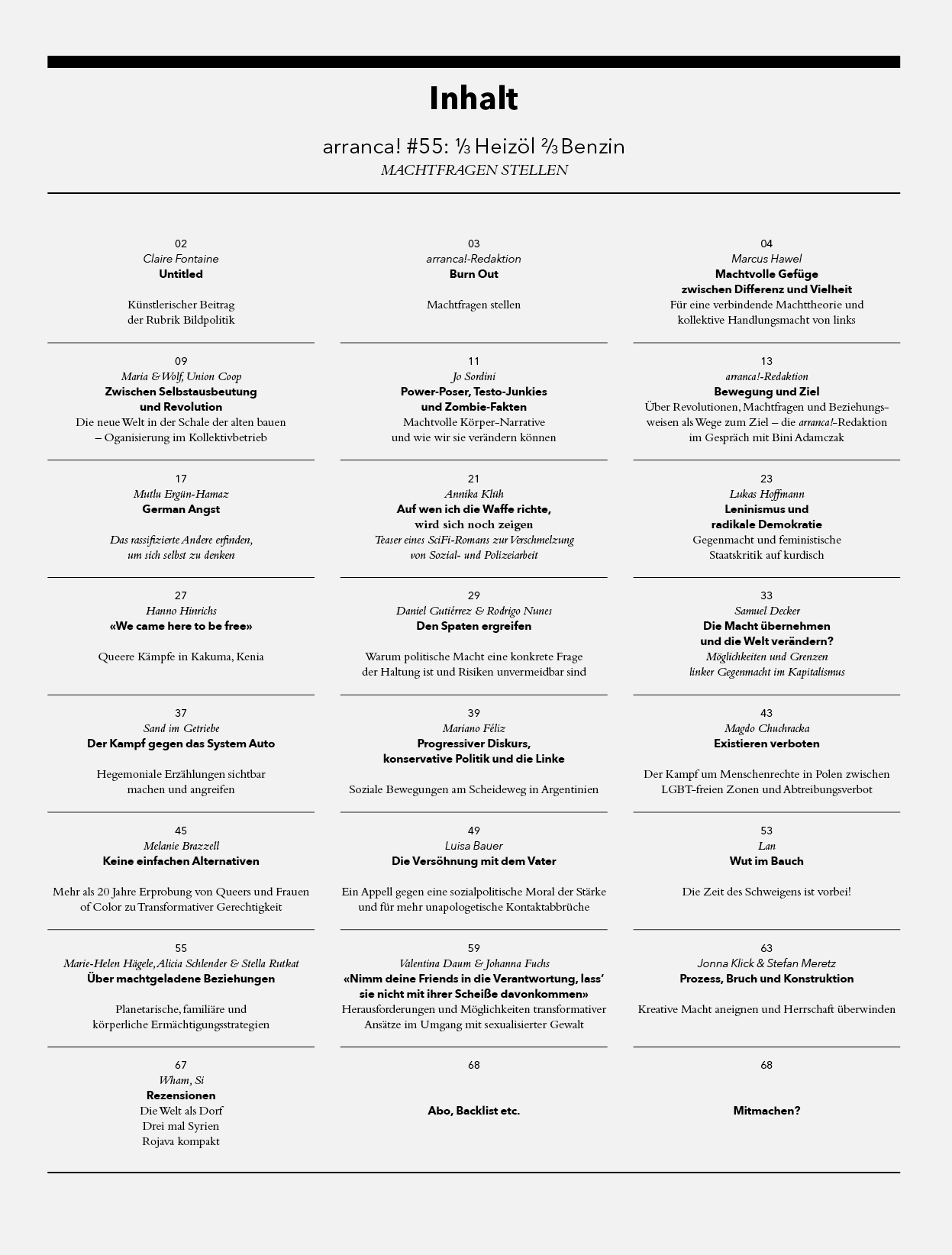 «Nimm deine friends in die Verantwortung» und «Wut im Bauch» widmen sich dem Umgang mit sexualisierter Gewalt und patriarchaler Macht, aus kollektiver und aus individueller Perspektive. «German Angst» beschäftigt sich mit der rassistischen Angst vor dem Anderen, «We came here to be free» und «Existieren verboten» schauen auf die Lebensbedingungen und Kämpfe von queers in Kenia und Polen. Mit diesen und weiteren Artikeln schließt sich der Kreis von Macht und Verantwortlichkeit von der Mikro- bis zur Makroebene.