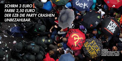 Ihr kürzt uns die Mittel, den Lohn und die Sozialleistungen, ihr verbietet unsere Demos und unsere Camps, ihr bringt uns zum Schweigen, damit Ordnung herrscht an der Heimatfront. Und trotzdem sollen wir für euch sterben, wir sollen für euch töten, wir sollen uns abrackern und wir sollen str