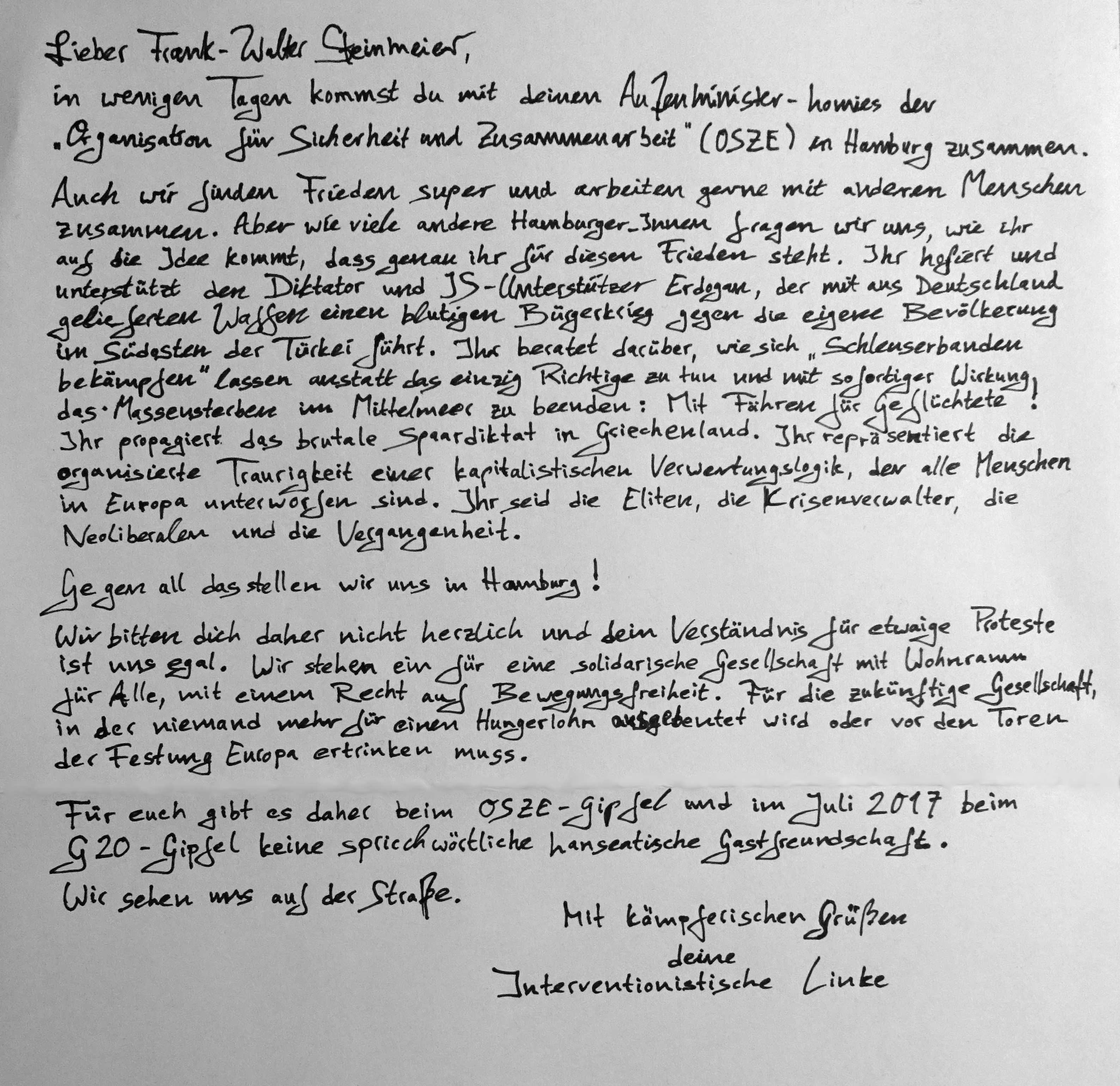 Echte Brieffreundschaften werden ja immer seltener. Steinmeiers Einladung an alle Hamburger_innen haben wir daher begeistert angenommen. Hier unsere Antwort: