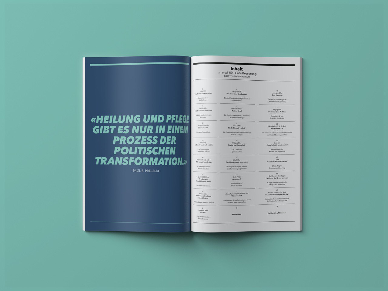 Artikel und Interviews von und mit Aktivist*innen der Gesundheitskollektive zeigen auf, wie eine bessere Gesundheitsversorgung konkret aussehen kann und warum soziale Lebensbedingungen nicht von individueller Gesundheit zu trennen sind. Andere Artikel, wie «Kapital und Gesundheit», eine Reflexion der Psychiatriekritik und «Carearbeit, die krank macht» in der Kinder- und Jugendhilfe nehmen Geschichte und Status Quo unter die Lupe. Schließlich widmen sich Artikel wie Resilienz als «neuester heißer Scheiß», «Digitalisiert und durchleuchtet» und «Aussortiert» den neuen Entwicklungen im Gesundheits- und Sozialsystem und deren Folgen.