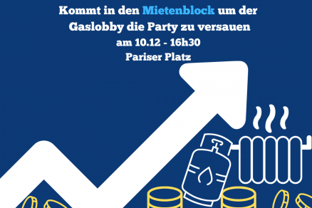 Doch statt auf unsere Probleme einzugehen, beraten Regierung und Wirtschaft bei Sektempfang im Adlon, wie noch mehr fossile Infrastruktur geschaffen werden kann, um uns so lang wie möglich von Gas abhängig zu machen. Dem stellen wir uns am 10.12 entgegen! Als Mieter*innen kämpfen wir für warme Wohnungen und eine lebenswerte Stadt, die nicht von Hitzewellen oder Dauerregen bedroht wird.