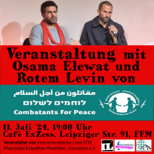 Macht euch ein eigenes BildWir haben Osama Elewat und Rotem Levin erneut nach Frankfurt eingeladen. Initiativen wie den Combatants for Peace wollen wir den Raum geben, die Stimmen aus Palästina und Israel in diesem endlosen Krieg brauchen. Ihnen und allen Menschen in Israel/Palästina, die gegen Krieg und Besatzung und die menschenverachtende Politik ihrer „Führungen“ kämpfen, gilt unsere Solidarität.