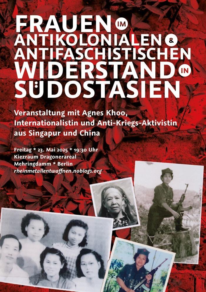 Eingeladen wurde Agnes Khoo aus Anlass des 80. Jahrestages der Befreiung vom deutschen Faschismus. Sie macht eine Rundreise durch verschiedene Städte und wir freuen uns, sie auch in Berlin begrüßen zu dürfen. Denn die militärische Eskalation unter den imperialistischen Mächten ist in vollem Gang. Wird Südostasien das nächste Zentrum im globalen Kriegsgeschehen? Was können wir von den revolutionären Kämpfer*innen lernen? Welchen Platz nimmt Feminismus im antimilitaristischen Kampf ein?