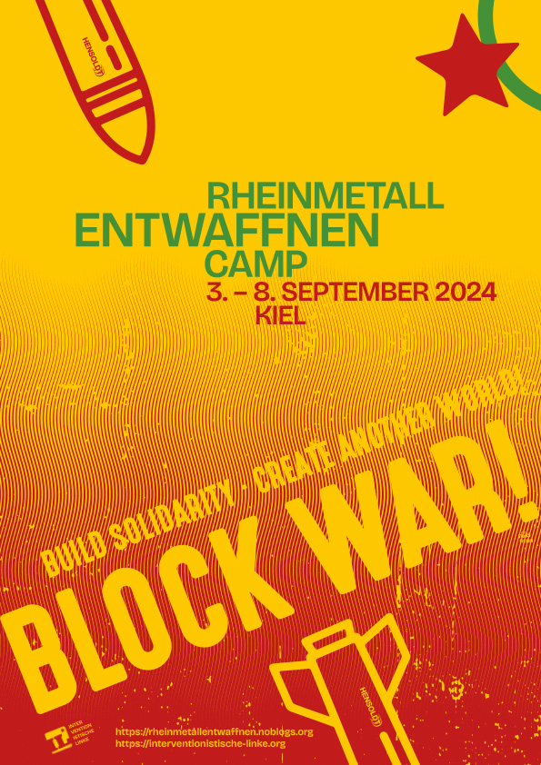 Widerstand gegen die neue Normalität von Aufrüstung, tausendfachen Tod, Flucht und Vertreibung ist das Gebot der Gegenwart. Wir werden uns gemeinsam mit vielen hundert Aktivist:innen vom Dienstag, 3. bis Sonntag, 8. September zu einem Aktionscamp in Kiel – einem der Rüstungs- und Militär-Hotspots in Deutschland – versammeln. Dort werden wir gemeinsam mit internationalen Freund:innen und Genoss:innen über Strategien für unseren gemeinsamen Kampf diskutieren und direkte Aktionen gegen Militär und Rüstungsindustrie durchführen.