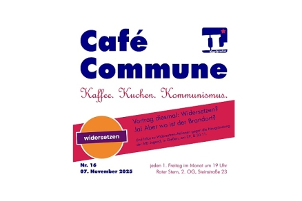 Euch erwarten Karaoke (mit Arbeiter*innenliedern), linke Kneipenquizze, Brettspiele, Filmabende und vieles mehr. Lasst euch überraschen! Jeden ersten Freitag im Monat organisieren wir von der Interventionistischen Linken Karlsruhe das Café Commune, zum genoss*innen-schaftlichen Zusammenkommen, Feiern, Snacken und Schnacken.
