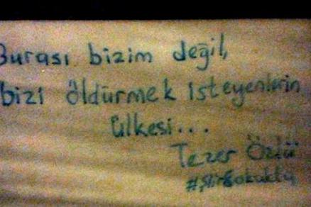 ist ein Zitat der türkischen Schriftstellerin Tezer Özlü. Sie schrieb es nach dem Kanlı 1 Mayıs 1977 (Blutiger 1. Mai) auf dem Istanbuler Taksim-Platz. Mit automatischen Waffen wurde damals in die unübersehbare Menge geschossen, Panzerwägen überrollten DemonstrantInnen. 34 Menschen starben, ca. 150 wurden verwundet, etwa 500 festgenommen. Aufgeklärt wurde das Massaker nie wirklich.