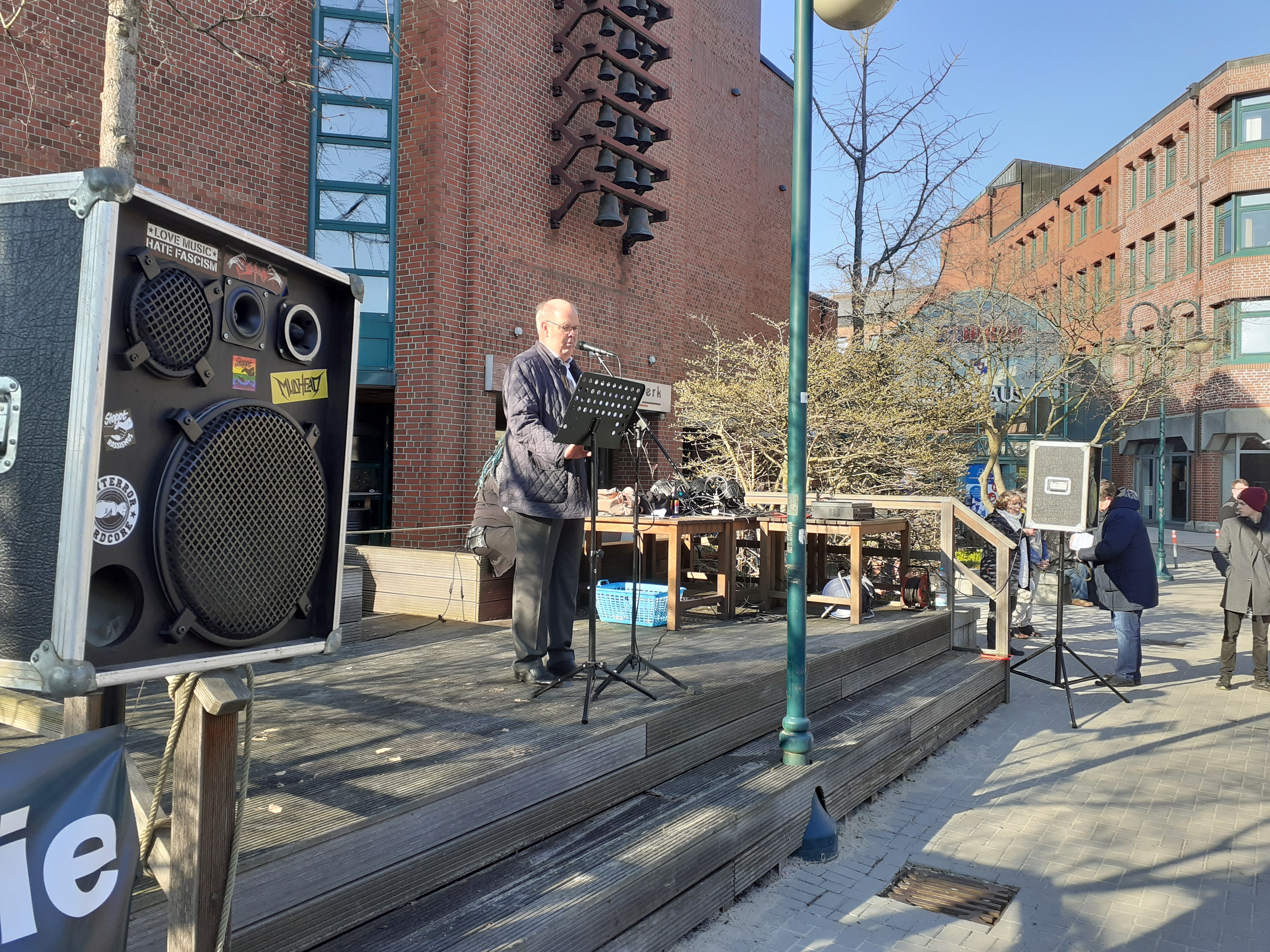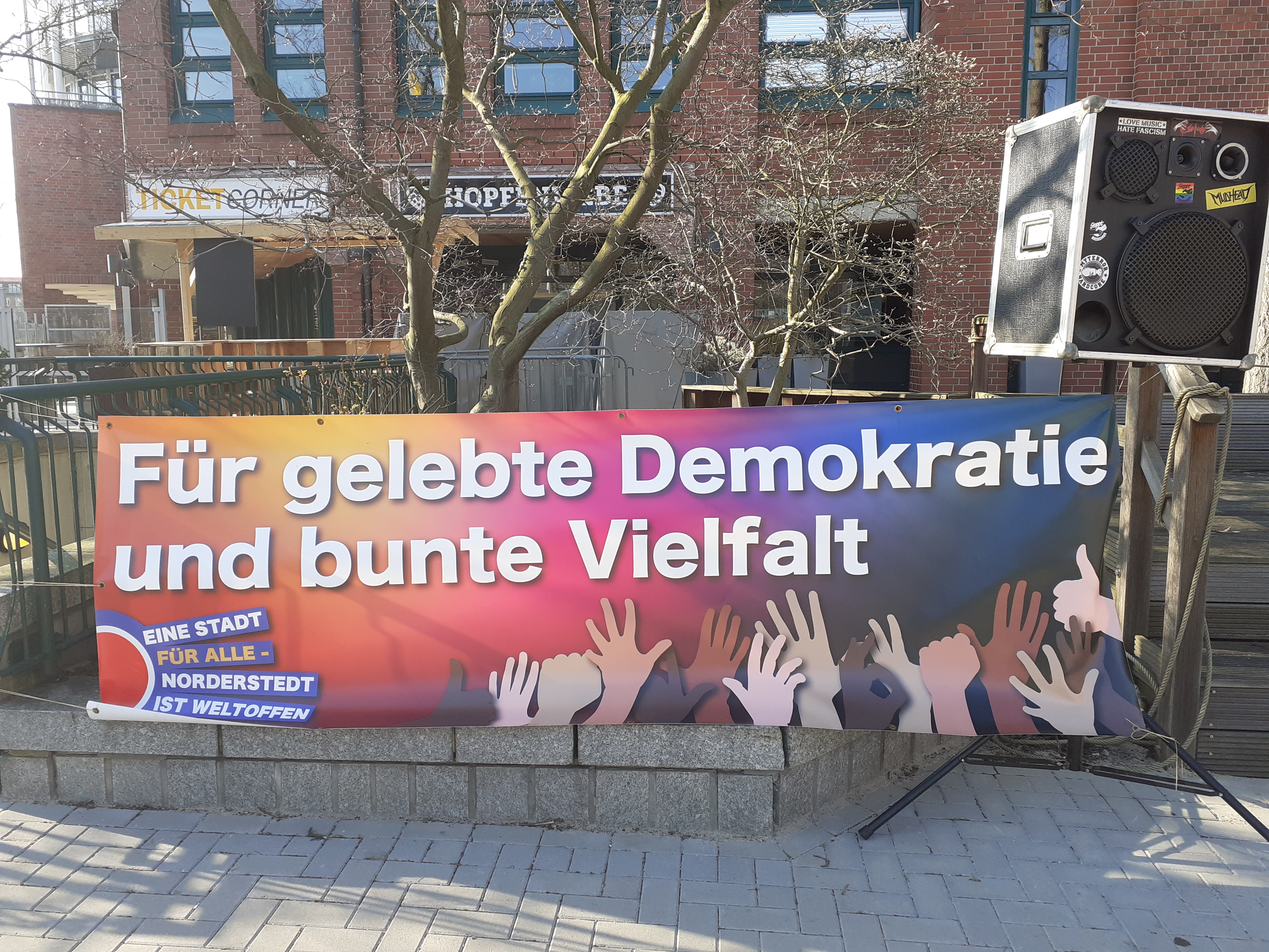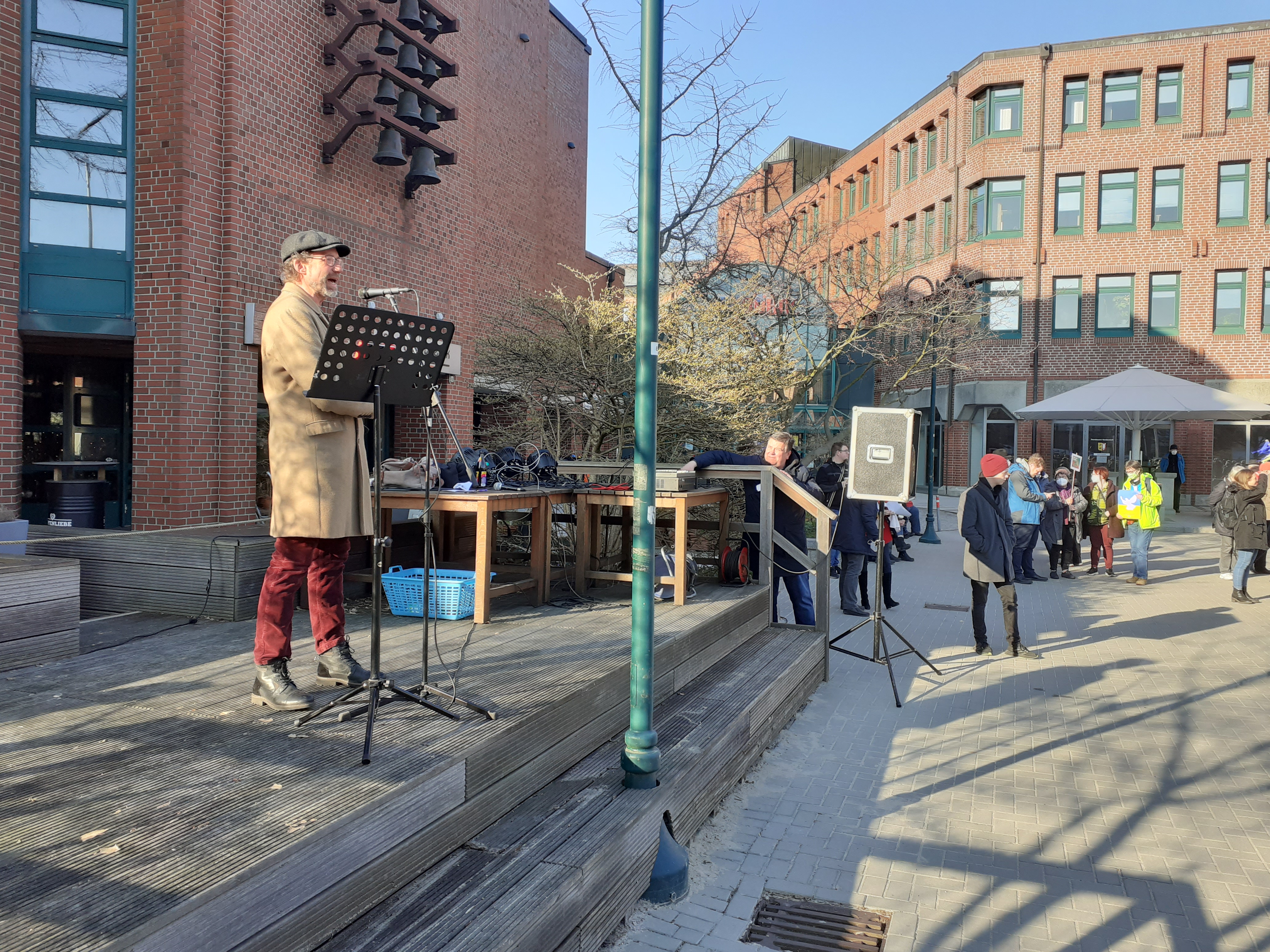Am Samstag, den 12.03.2022 folgten mehrere hundert Menschen in Norderstedt dem Aufruf des Bündnisses „Norderstedt ist weltoffen“ zu einer Friedenskundgebung auf dem Rathausplatz. Diese sollte ein Zeichen der Solidarität setzen mit den von Krieg und Vertreibung betroffenen Menschen in der Ukraine und der Forderung nach einem sofortigen Stopp der Kampfhandlungen Gehör verschaffen.