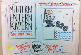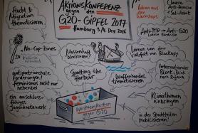 Mittlerweile haben wir mehrere Arbeitsgruppen, die sich mit den Themenfeldern Antifaschismus, Antirassismus und Migration, (Queer-)Feminismus, Klima sowie Recht auf Stadt beschäftigen und natürlich momentan auch zum drohenden G20-Gipfel arbeiten.