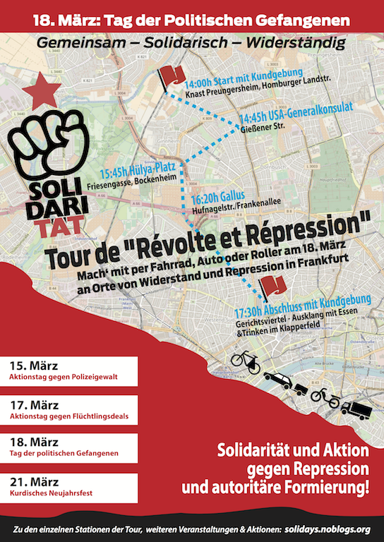 in Frankfurt wird es am Aktionstag 18 März  eine mobile Demonstration als Fahrrad- und Autocorso geben. Wir werden Orte ansteuern die für die Repression stehen, aber auch für gemeinsame Kämpfe.
