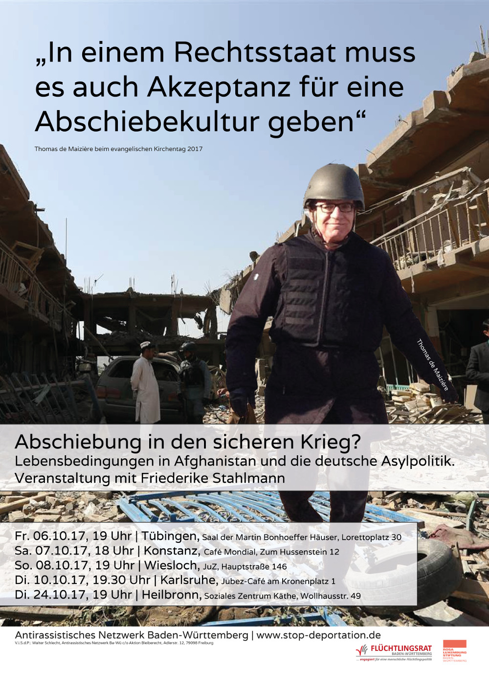 Im Rahmen einer Veranstaltungsreihe des Antirassistischen Netzwerks Baden-Württemberg. Weitere Veranstaltungen am am 7.10. in Konstanz, am 8.10. in Wiesloch, am 10.10. in Karlsruhe.Mehr Infos: www.stop-deportation.de