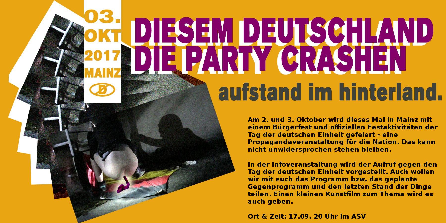 Am 2. und 3. Oktober wird dieses Mal in Mainz mit einem Bürgerfest und offiziellen Festaktivitäten der Tag der deutschen Einheit gefeiert - ein Propagandaveranstaltung für die Nation. Das kann nicht unwidersprochen stehen bleiben.In der Infoveranstaltung wird der Aufruf gegen den Tag der deutschen Einheit vorgestellt. Auch wollen wir mit euch das Programm bzw. das geplante Gegenprogramm und den letzten Stand der Dinge teilen. Einen kleinen Kunstfilm zum Thema wird es auch geben.